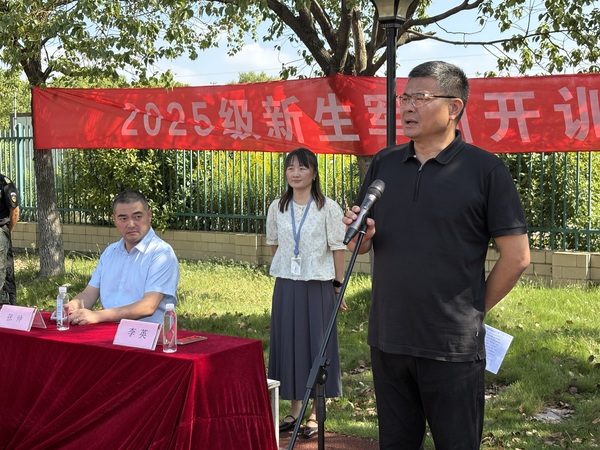 副校长戎成代表学校发表讲话,他详细阐述了军训的三大核心安排:两校区1200余名新生同步参训,其中尹山校区涉及6个班级,军训为期7天,第7天下午将开展两校区军运会操演出,检验训练成果。同时,他回顾了学校军训时间的调整历程——2018年起从9月调整至10月,正是为了给新生创造更凉爽的参训环境。