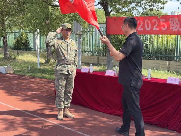 在全场的瞩目下,戎成副校长为军训教官授旗,鲜艳的旗帜在阳光下迎风飘扬,也正式点燃了新生们的训练热情。授旗仪式后,戎成副校长宣布2025级新生军训正式开训,各班随即有序前往训练场地,开启为期一周的蜕变之旅。
